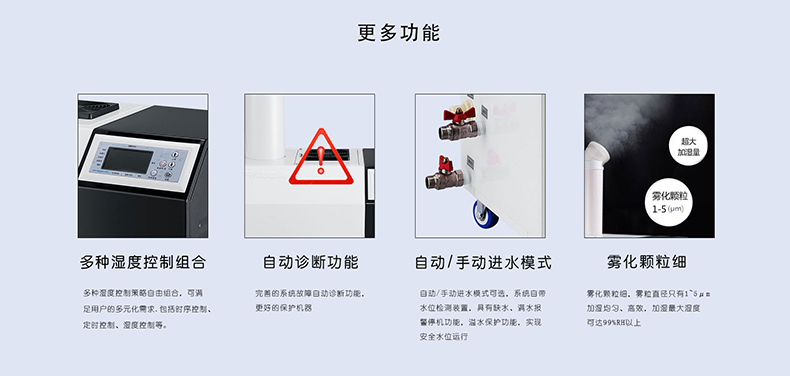 ※ 濕度數(shù)碼全自動控制,控制系統(tǒng)配備進口濕度傳感器,控制精度高、反應(yīng)迅速。設(shè)定后連續(xù)工作, 無    需人員職守